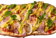 500 г • Ветчина, моцарелла, шампиньоны, горчичный соус, соус из томатов, петрушка